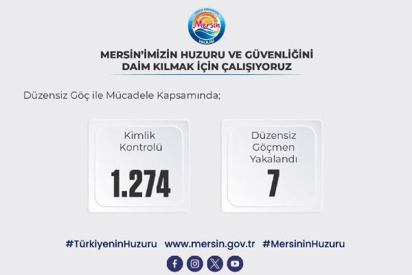 Mersin Valiliği, " ’Düzensiz Göç ile Mücadeleye Yönelik Huzur Uygulaması’ kapsamında 1.274 kişinin kimlik kontrolü gerçekleştirildi, 7 yabancı uyruklu şahıs yapılan kontroller sonucunda, Düzensiz Göçmen Ön Kabul ve Sevk Merkezine gönderildi."
