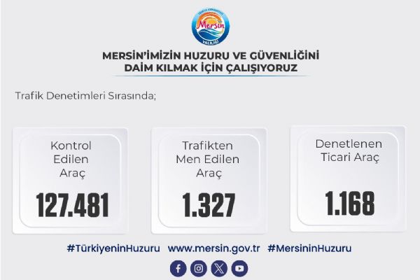 Trafik denetimleri kapsamında; 127.481 araç kontrol edildi, 1.327 araç trafikten menedildi, 1.168 ticari taksi denetlendi.