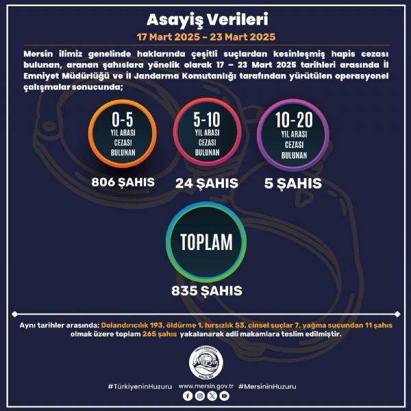 "Mersin genelinde haklarında çeşitli suçlardan kesinleşmiş hapis cezası bulunan, aranan şahıslara yönelik olarak, 17 – 23 Mart 2025 tarihleri arasında İl Emniyet Müdürlüğü ve İl Jandarma Komutanlığı tarafından yürütülen operasyonel çalışmalar sonucunda;