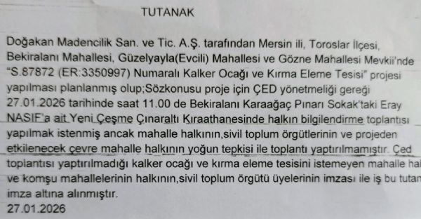Toroslar'ın yayla olarak kullanılan bölgelerinde, Doğakan Madencilik San. Ve Tic. Şi. tarafında kurulması planlanan Kalker Ocağı ve Eleme Tesisi Projesi'nin ÇED raporu bilgilendirme toplantısı, Bekiralanı, Güzelyayla, Gözne Mahalleri sakinleri ve sivil toplum örgütleri temsilcilerinin katılımıyla engellendi.
